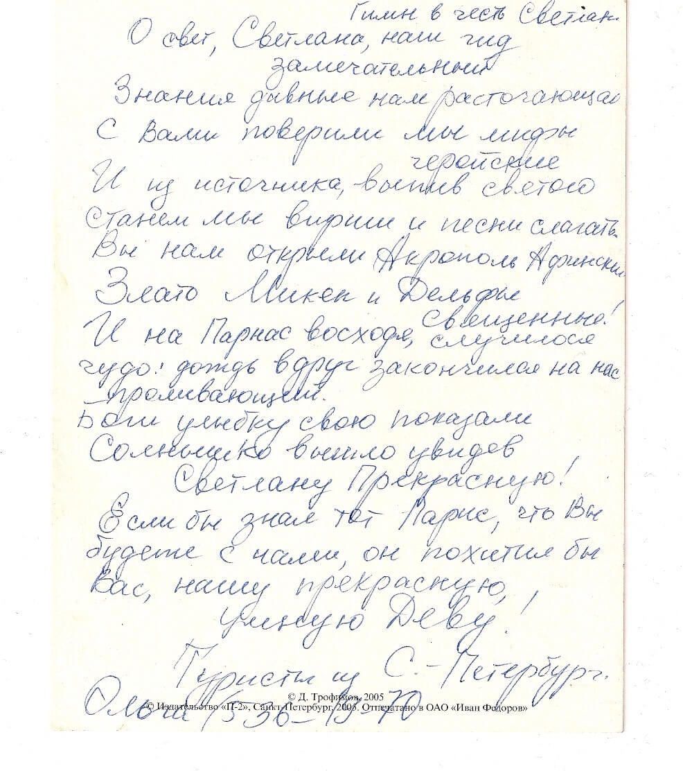 Светлана, хотим выразить Вам свою благодарность, а также поделиться своим мнением о проведенных с Вами нескольких днях. Начали мы наше знакомство со Светланой с обзорной экскурсии по Афинам и встреча наша произошла в порту, так как мы путешествовали на круизном лайнере. С первой минуты нашего знакомства наш экскурсовод поразила нас своей внимательностью, красивым ухоженным видом и естественно своей манерой проведения экскурсии. Чётко поставленная речь, интересные факты, рассказ, забота о нашем самочувствии, ведь было очень жарко!